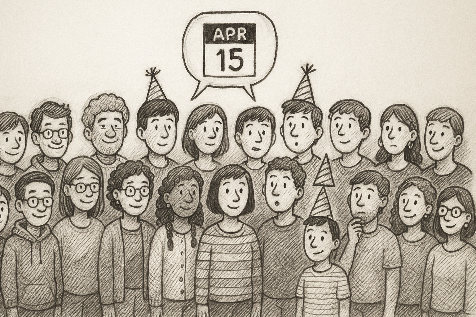 When you’re one of the people in the group, you’re comparing yourself to 22 other people. With 22 chances the 50% probability seems strange. But there are 22 other people also comparing birthdays. 23 people at the start, then 22 people, then 21 people and so on. When we add up the number of comparisons we get a finite arithmetic series with a sum of 253. That’s 253 chances for a shared birthday.